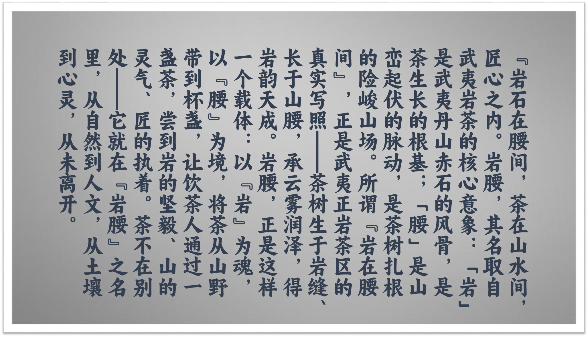 在这个快节奏的时代,岩腰甘愿做一个“慢”的坚守者。我们存在的意义,不仅是做出一杯好茶,更是希望与您一起,通过这一盏醇厚的茶汤,重新建立与自然的连接,感受时间的重量,体验东方美学中“物我两忘”的宁静与愉悦。我们期待,成为您茶席上最值得信赖的分享者,成为您探索岩茶深邃世界的同行者。岩腰敬奉您的每一份品味与知遇。